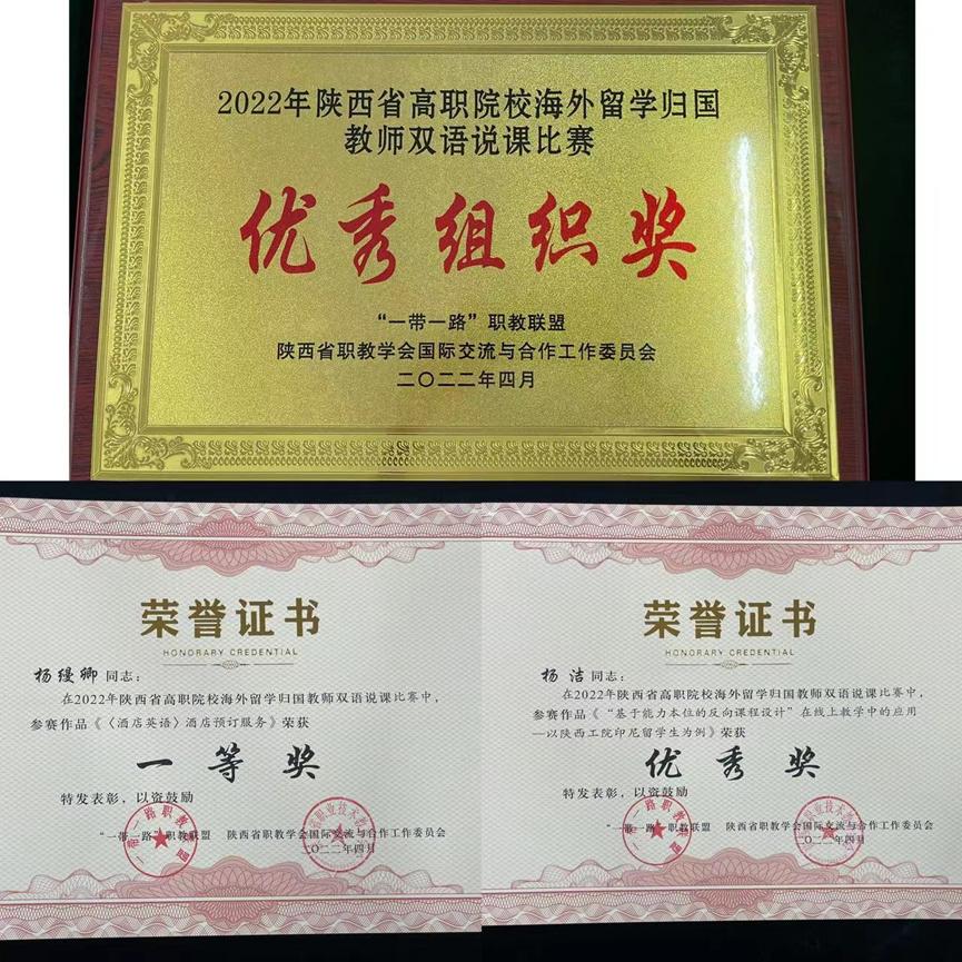 由“一带一路”职教联盟和陕西省职业技术教育学会主办的首届陕西省高职院校海外留学归国教师说课比赛于近期举行。经过视频初审、现场展示等环节,我校财经与旅游学院“双语”教师杨缦卿斩获一等奖,杨洁获优秀奖,我校获得优秀组织奖。