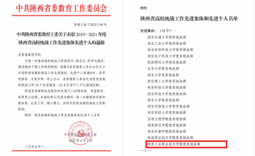 近日,中共陕西省委教育工委下发《关于表彰2019—2021年度陕西省高校统战工作先进集体先进个人的通报》(陕教工函〔2022〕90号),我校荣获“陕西省高校统战工作先进集体”称号。