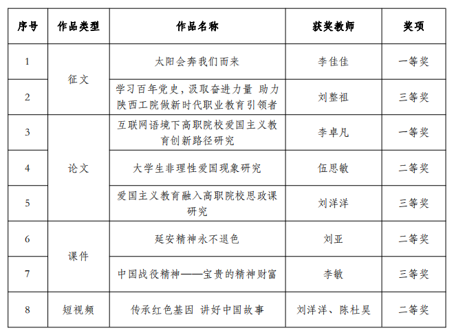 近日,我校8名教师的作品在全国爱国主义主题作品征集评选活动中获一、二、三等奖,其中李佳佳撰写的征文《太阳会奔我们而来》,李卓凡撰写的论文《互联网语境下高职院校爱国主义教育创新路径研究》荣获一等奖;伍思敏、刘亚、刘洋洋、陈杜昊的作品荣获二等奖;刘洋洋、刘整祖、李敏的作品荣获三等奖。