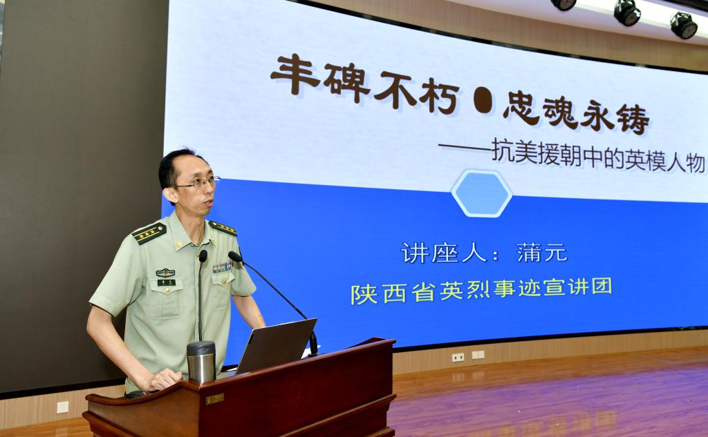 报告会上,李俊春巡视员、贺天柱副书记先后致辞,蒲元副主任以《丰碑不朽、忠魂永驻——抗美援朝中的英模人物》为题作了英烈事迹宣讲,带领同学们回顾了抗美援朝战争艰苦卓绝的岁月,重温了杨根思、冰雕连等志愿军英烈感人至深的故事。学校大学生艺术团的同学们表演了以讴歌延安精神为主题的诗朗诵《一条路?一盏灯》。最后,宣讲活动在全场师生《歌唱祖国》的歌声中圆满结束。