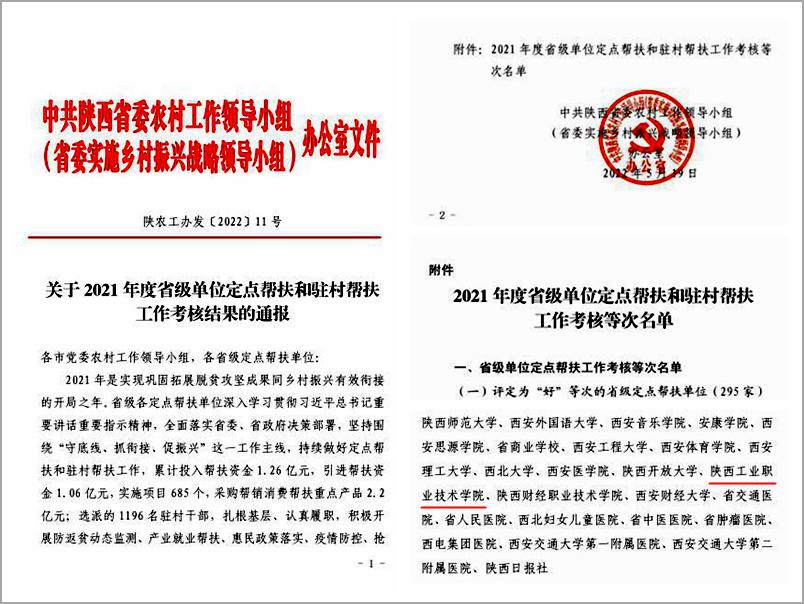 日前,中共陕西省委农村工作领导小组(省委实施乡村振兴战略领导小组)下发《关于2021年度省级单位定点帮扶和驻村帮扶工作考核结果的通报》(陕农工办发〔2022〕11号)文件,我校在2021年度省级单位定点帮扶和驻村帮扶工作考核中荣获先进单位,这也是我校连续第四年获得该项荣誉。