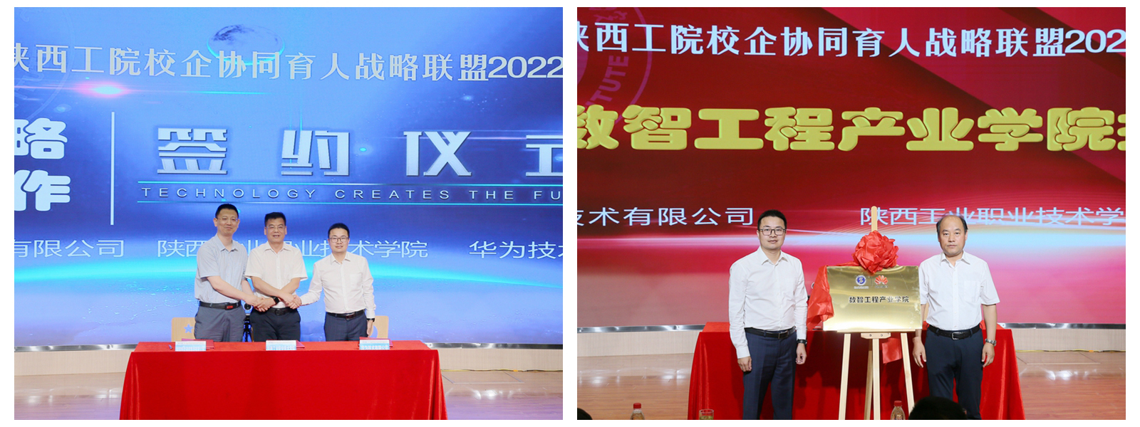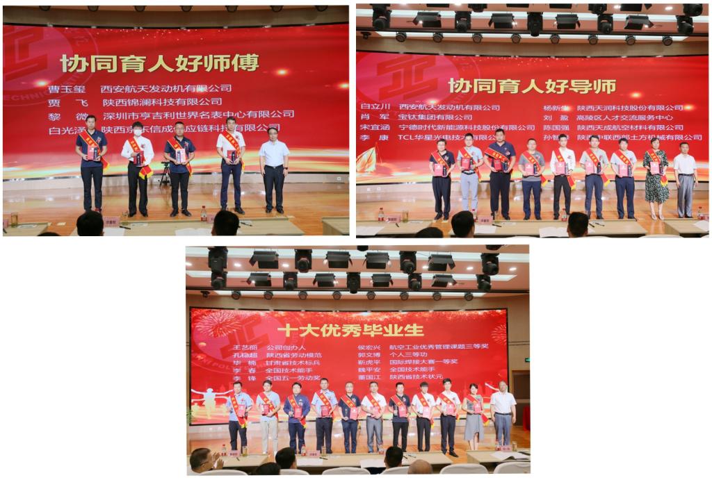 副校长梅创社宣读《关于表彰学院“协同育人好师傅”“协同育人好导师”的决定》《关于表彰学院第三届“优秀毕业生”的决定》。与会领导分别为“协同育人好师傅”“协同育人好导师”“十大优秀毕业生”获得者颁奖。随后,我校与华为、中国移动签署三方战略合作协议,并为“数智工程产业学院”揭牌。我校分别与渭南高新技术产业开发区和西安经发建设工业园区签订战略合作协议,与西安航天发动机有限公司、渭化集团进行现场学徒制签约。