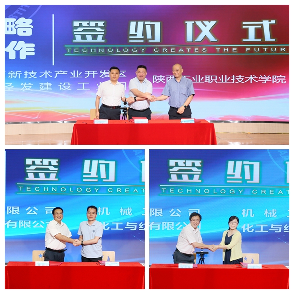 我校与渭南高新技术产业开发区、西安经发建设工业园区签订战略合作协议,与西安航天发动机有限公司、渭化集团进行现场学徒制签约