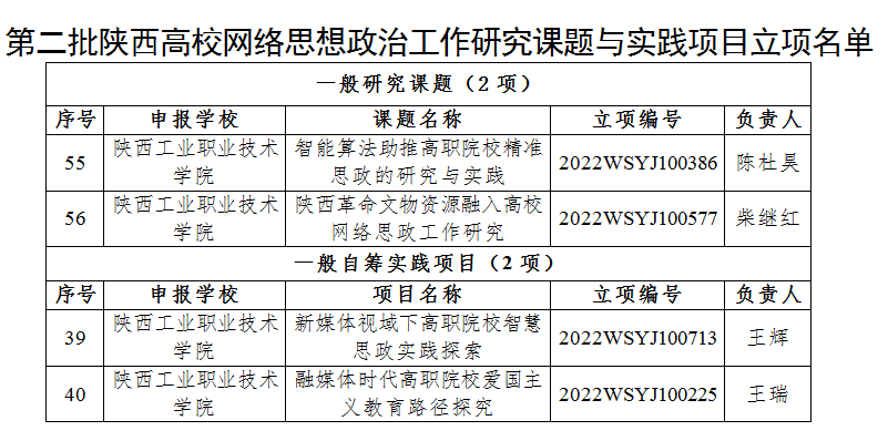 此次立项中,马克思主义学院陈杜昊主持的《智能算法助推高职院校精准思政的研究与实践》、宣传部柴继红主持的《陕西革命文物资源融入高校网络思政工作研究》获批一般研究课题;马克思主义学院王辉主持的《新媒体视域下高职院校智慧思政实践探索》、宣传部王瑞主持的《融媒体时代高职院校爱国主义教育路径研究》获批一般自筹实践项目。第二批陕西高校网络思想政治工作研究课题与实践项目旨在贯彻落实全国、全省教育大会和高校思想政治工作会议精神,推进落实《教育部等八部门关于加快构建高校思想政治工作体系的意见》(教思政〔2020〕1号)文件精神,提升我省高校网络思政工作水平。我校高度重视网络思想政治研究工作,2021在首批陕西高校网络思想政治工作研究课题中成功获批3个项目。在本次课题申报工作中,宣传部积极组织专家进行校内评审和课题申报辅导并推荐11个项目参加省上评审,最终4个项目获批立项。