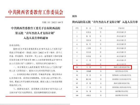 陕西高校“青年杰出人才支持计划”着眼于人才基础性培养和战略性开发,旨在加快提升陕西省高端人才储备,着力培养、造就一批青年学术骨干,构筑良好的人才发展梯队。该项目从2017年开始实施,已评选六批,我校共有4位教师入选。