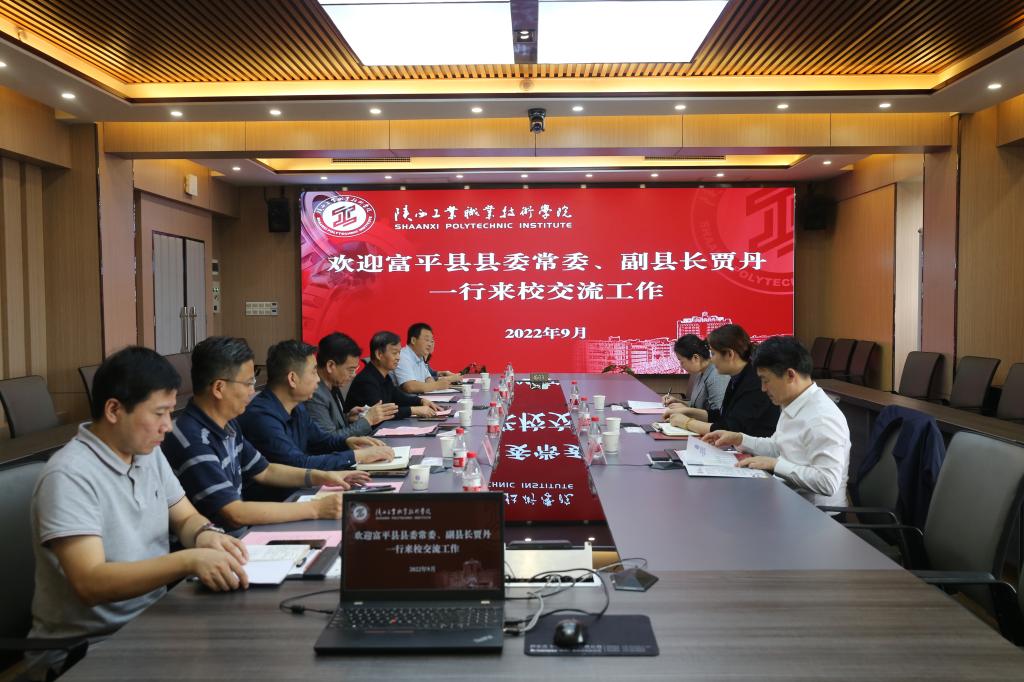 9月22日下午,富平县县委常委、副县长贾丹,富平县教育局党委书记、局长雷建庄,富平县教育局党委副书记、富平职业教育中心党总支书记王荣娟等一行4人来我校交流座谈。我校校长刘永亮、党委副书记贺天柱及相关部门负责人陪同座谈。