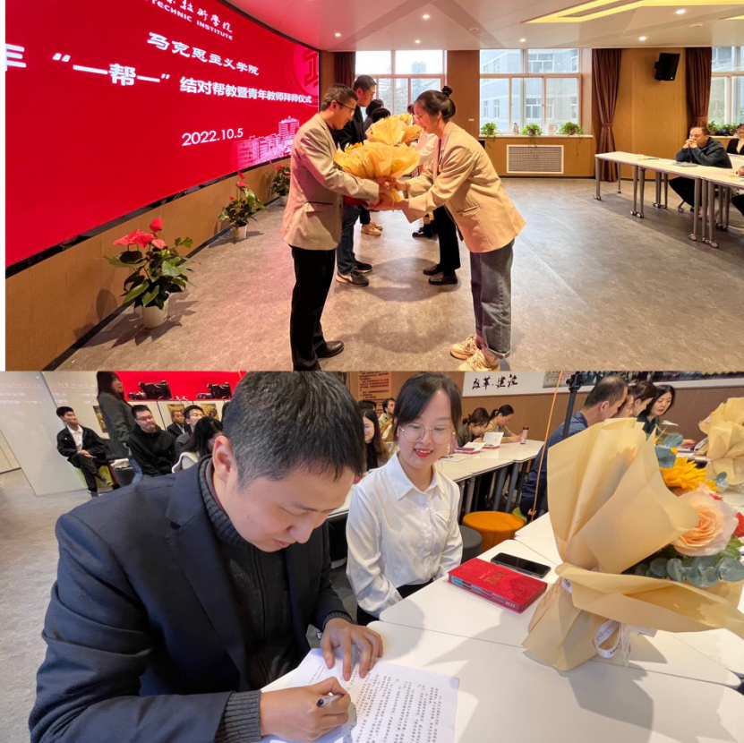 拜师仪式上,王辉副院长首先宣读了《马克思主义学院2022年新入职“一帮一”结对帮教实施方案》,王艳副院长宣布了青年教师结对培养名单,梅创社副校长和殷锋社处长为指导教师颁发了聘书。在全体与会人员的见证下,马院12位青年教师满怀对指导教师的尊敬和对教育事业的热忱,为师傅们送上鲜花并鞠躬行拜师礼,表达着徒弟最真挚的拜师诚意。指导教师向青年教师回赠书籍,传递着对新教师的谆谆教导和殷切期望,师徒双方正式缔结携手并进的帮教情谊。