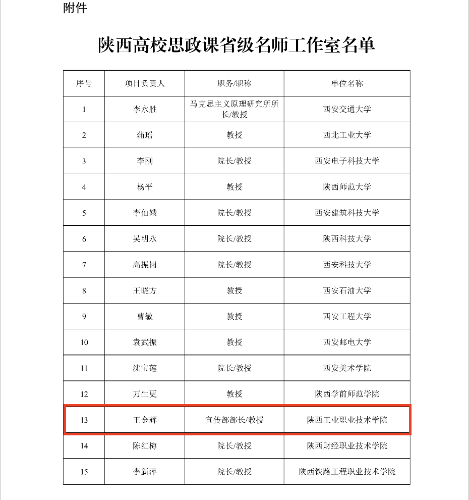 近日,省委教育工委办公室、省教育厅办公室公布了全省高校思政课省级名师工作室名单,我校王金辉教授申报的“秦马思享”名师工作室成功获批。