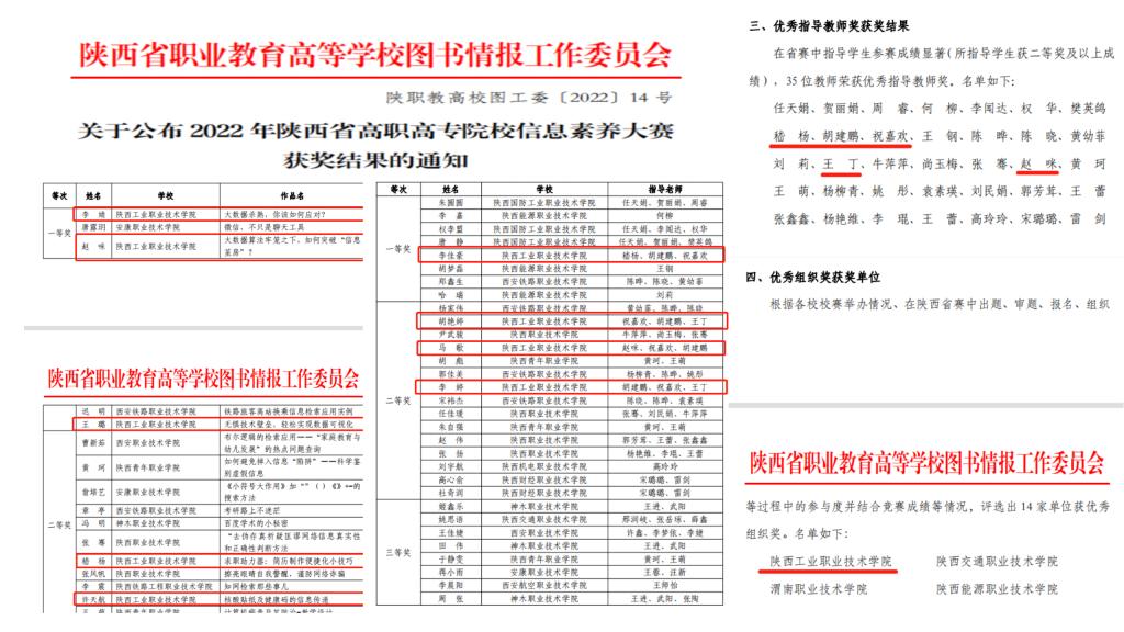 近日,2022年陕西省高职高专院校信息素养大赛圆满落幕,我校师生在教师微课赛与学生个人赛中均取得了不俗成绩,斩获了四项一等奖,学校荣获“优秀组织奖”。