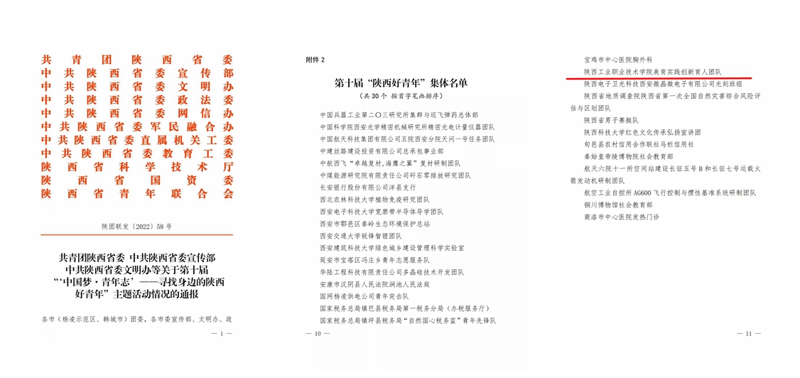 近日,由团省委、省委宣传部、省委文明办、省委政法委、省委网信办、省委军民融合办、省委直属机关工委、省委教育工委、省科技厅、省国资委、省青联等单位共同举办的第十届“‘中国梦·青年志’——寻找身边的陕西好青年”主题活动结果揭晓,经推报、初选、复核、展示、评审等环节,我校美育实践创新育人团队荣获第十届“陕西好青年”集体荣誉称号。