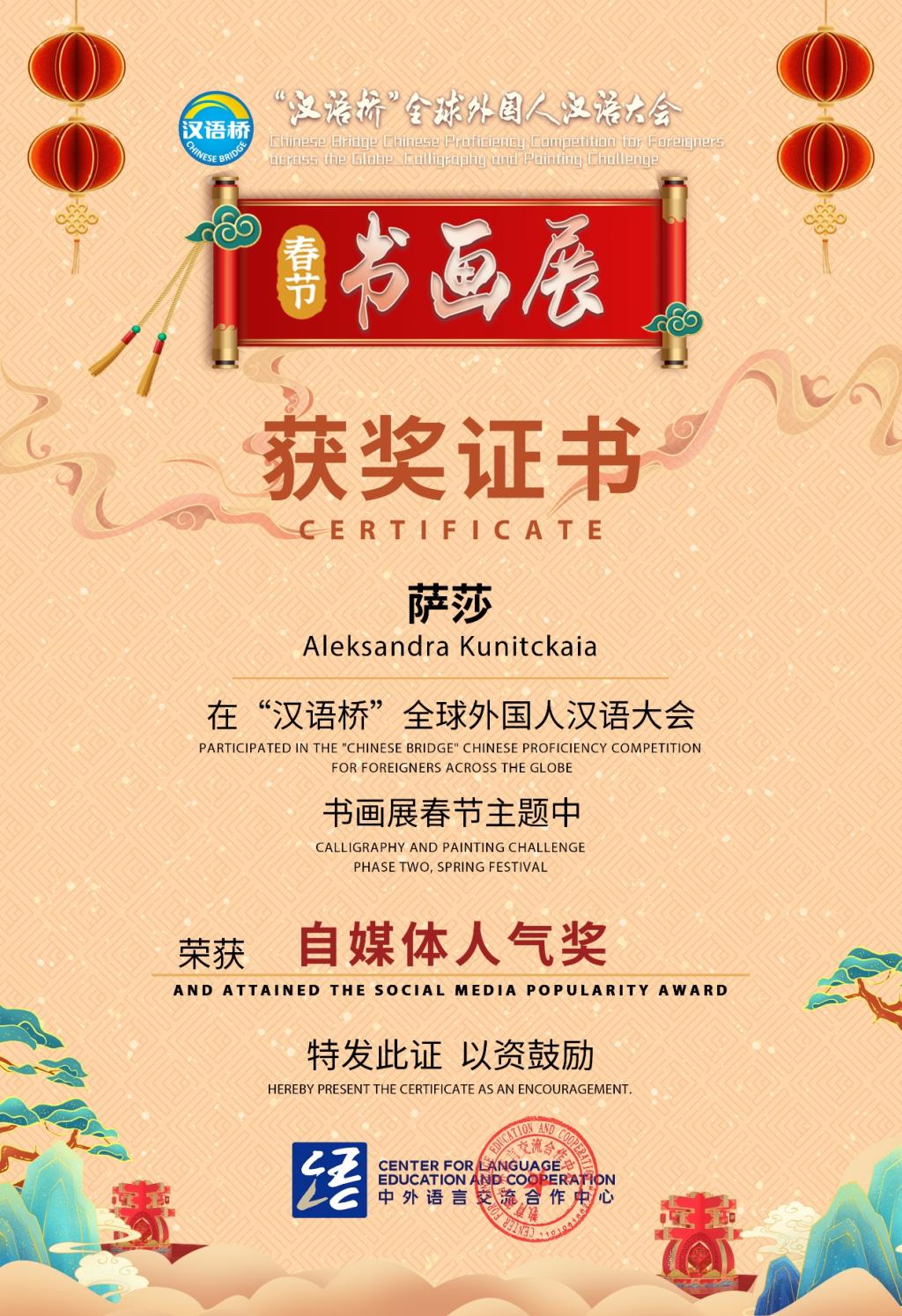 留学生萨莎在“汉语桥”书画展春节主题中荣获“自媒体人气奖”