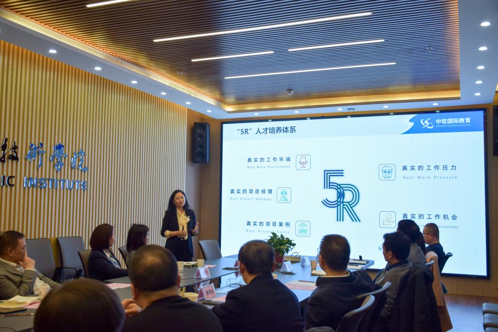 在听取了惠朝阳书记的详细介绍后,中软国际教育副总裁成焕对我校的办学理念和厚重历史表示钦佩和感动,并围绕“产教深度融合,共建人才新生态”这一主题,从中软国际及教育集团简介、中软国际与高校人才培养合作模式两个方面作了专题汇报。她表示,中软集团会以最开放的理念、最大的诚意为双方深化合作提供保障,共挖校企合作亮点,共同打造校企合作新样板,实现资源共享、发展共赢。