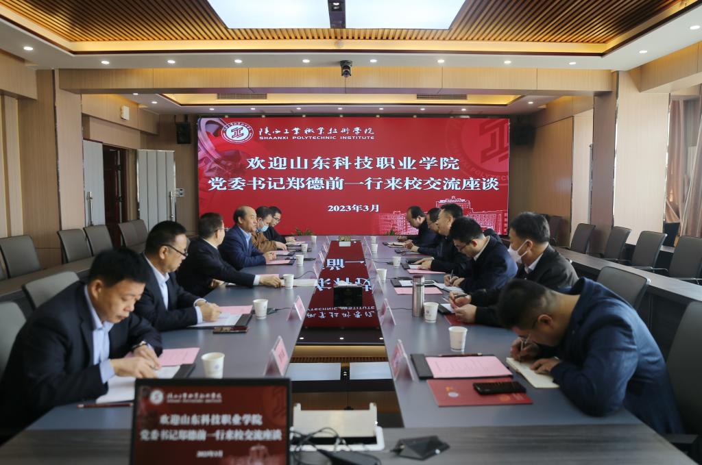 郑德前书记对我校的发展历史、办学理念、陕工精神、校企合作大加赞赏,并对我校近年来的办学成绩给予高度评价,简要介绍了山东科技职业学院基本情况及发展现状,并对山东科技职业学院的1个目标3步走的学校战略进行了着重介绍。随后,双方相关对口部门就“双高计划”建设、智能制造类专业建设及实训基地建设等内容进行了深入交流。