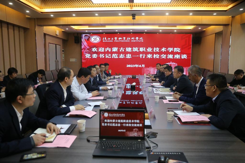 座谈会上,校长刘永亮首先对范志忠书记一行的来访表示欢迎,在观看完学校宣传片后,刘永亮以我校“三件大事、三个重点、三个问题、三项成果”的“四个三”为主题,详细介绍了我校专业建设、师资队伍建设、产教融合、校企合作等方面工作情况,使范志忠书记一行对我校的办学宗旨、精神品格等有了更深层次的认识和了解。范志忠书记对我校发展历程与近年来取得的办学成绩给予了高度赞赏,并简要介绍了内蒙古建筑职业技术学院学校办学历史及发展现状,希望进一步与我校加强联系,互相学习,共谋发展。随后,双方相关对口部门就“双高计划”建设、申建职业本科院校、党建工作、校园文化建设、后勤服务保障、学生工作等方面进行了深入的交流。