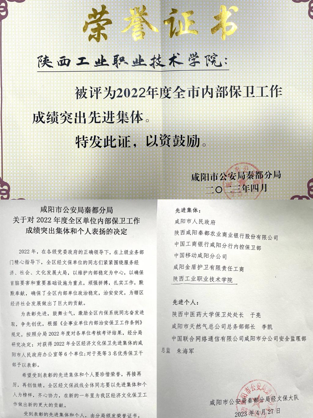 4月27日上午,咸阳市公安局秦都分局召开2023年度经济文化保卫工作会议,参会单位共70余家,与会代表共计100余人。我校荣获“2022年度全区单位内部保卫工作成绩突出集体”。