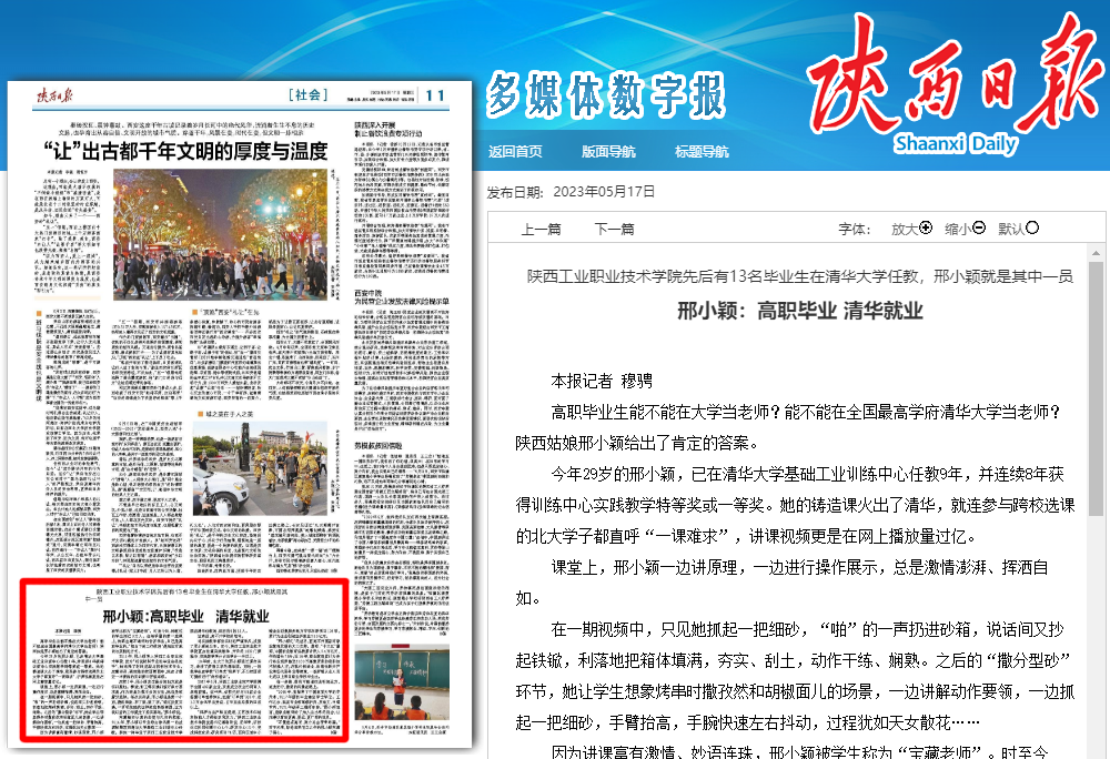 5月17日,2023年职教活动周之际,《陕西日报》以《邢小颖:高职毕业,清华就业》为题,报道我校专注培养高素质技术技能人才,赋能职业教育发展的典型经验,全文如下: