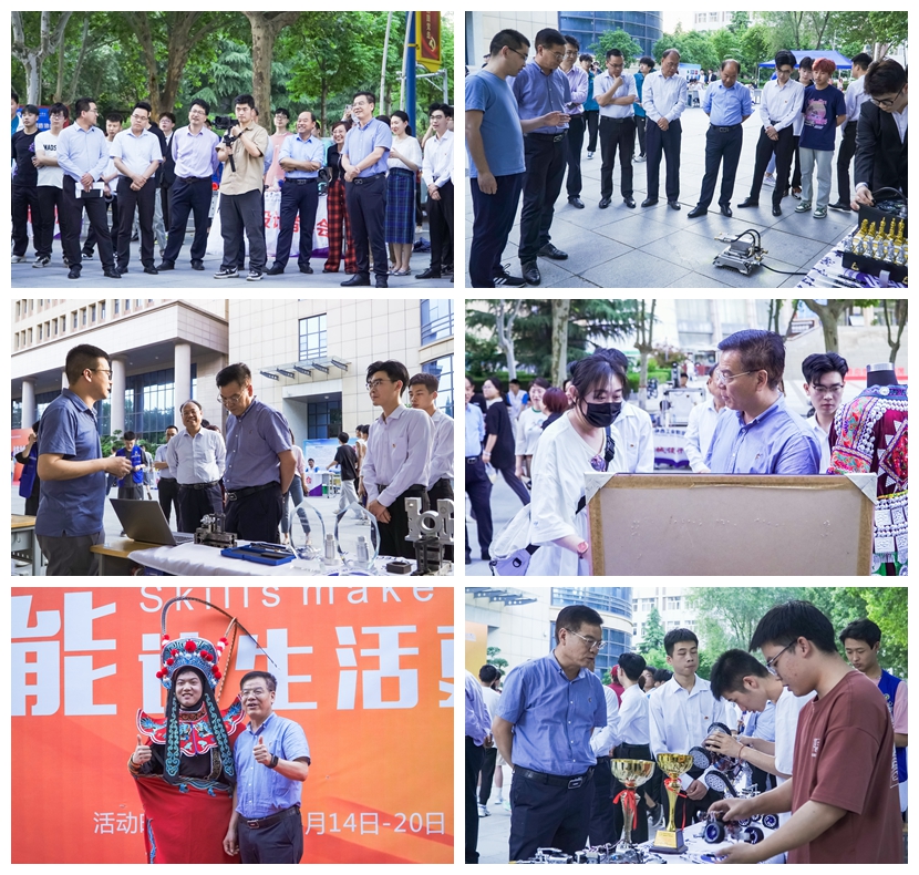此次活动围绕“技能:让生活更美好”主题,聚焦五育并举,按照思想政治类、学术科技类、文化体育类等学生社团类型进行布展,校长刘永亮、党委副书记贺天柱、副校长梅创社、刘清及宣传部、学工部、科研处、团委等部门负责同志,参与学生社团技能展示活动,边走边看,边听边问,在每个学生社团展台前驻足观看,并与学生社团成员和指导教师亲切交谈。现场观看了学生科技作品和学生社团技能展示,思想政治类学生社团展示了融合红色元素的短视频、海报、文创作品等,令人耳目一新。学术科技类学生社团一边介绍新作品、新产品,一边为参观的师生讲解设计和制作过程;文化体育类学生社团现场展示才艺,并亮出看家绝活,赢得现场师生热烈掌声;一件件精美的作品、一个个专业技能的展示,受到了现场师生的赞扬和好评。