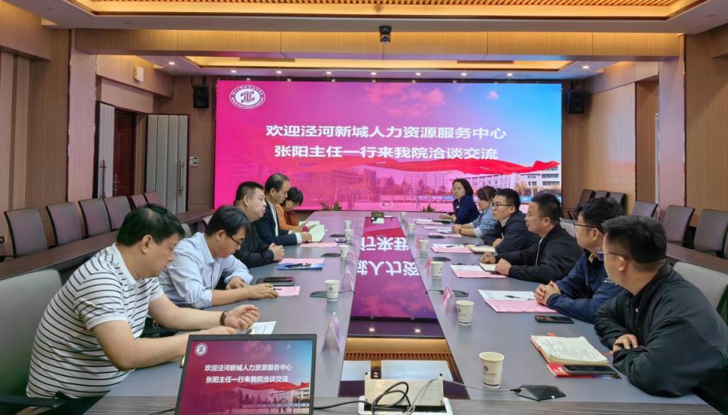 交流座谈会上,在观看完学校的宣传片后,段峻副校长对张阳主任一行人的到来表示热烈欢迎,并介绍了学校的发展情况。张阳主任对我校的热情接待表示感谢,并介绍了泾河新城人力资源服务中心及来访企业的发展现状、人才需求及合作意向。双方希望以此次交流座谈为契机,充分发挥资源优势,在人才培养、校企合作等方面加强交流、深化合作。