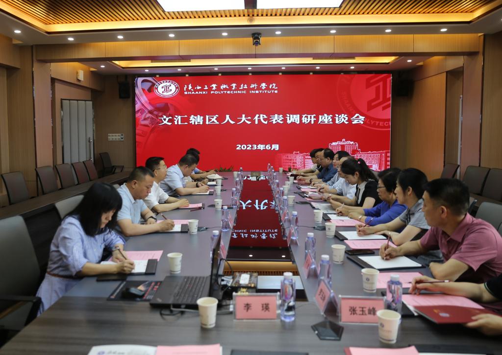 座谈会上,惠朝阳对各位代表来校调研表示热烈欢迎,对文汇辖区长期以来关心和支持学校发展表示衷心的感谢,并向各位代表简要介绍了学校的发展历程、办学特色以及近年来所取得的办学成绩,还重点就学校职教本科创建及新校区二期规划有关情况向代表进行了介绍,希望人大代表关注教育、支持教育、宣传教育,通过实地参观调研,进一步认识和了解陕西工院,对学校的发展建设献计献策,学校将始终坚持服务国家和服务区域发展相统一,发挥人才培养服务地方,教研资源共享地方的办学优势,为地方经济发展作出更大的贡献。郭霜之简要介绍了本次调研基本情况,表示学校作为西部高职院校的“排头兵”,改革发展成绩有目共睹,尤其在技能人才培养上取得了一定的成绩,希望学校为地方经济建设和社会发展培养更多高素质人才,同时表示将积极发挥区人大代表应有作用,充分利用好学校宝贵的办学资源,协助学校落实和解决学校发展过程中面临的问题,合力推进学校实现职业教育本科院校的办学目标。随后,双方结合各自工作领域,围绕校地融合发展进行了深入交流。代表们对我校的办学理念、规划建设、技能人才培养理念等给予了高度评价和充分肯定,并表示将继续关注学校办学工作,充分发挥人大代表优势,积极履职尽责,共同携手推进内涵式高质量发展。