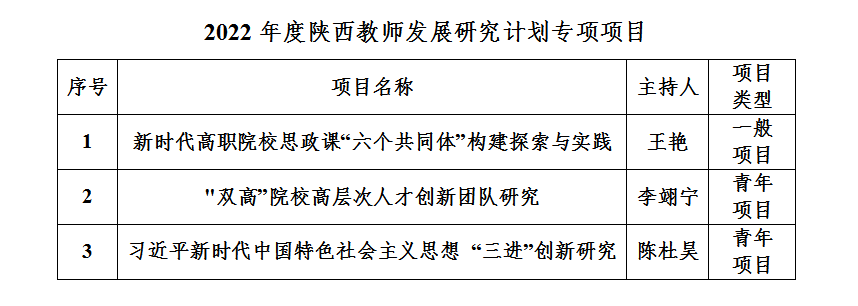 近日,陕西省教育厅印发《关于下达2022年度陕西教师发展研究计划专项项目的通知》(陕教函〔2023〕354号),经个人申报、学校推荐、省教育厅评审,我校获批专项项目3项,其中一般项目1项、青年项目2项。