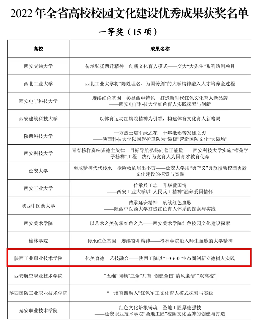 近日,中共陕西省委教育工委对2022年全省高校校园文化建设优秀成果予以通报表彰,我校申报的《化美育德 艺技融合——陕西工院以“1-3-6-0”生态圈创新立德树人实践》荣获一等奖。多年来,我校积极响应教育工委号召,着力构建具有陕工特色的校园文化格局,为努力培养德智体美劳全面发展的社会主义建设者和接班人提供了不竭的精神动力和文化支撑。我校将以此为契机,珍惜荣誉,再接再厉,充分发挥示范引领作用,切实推进校园文化建设水平再上新台阶。
