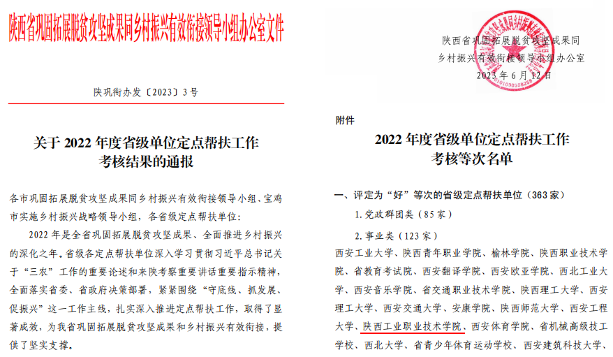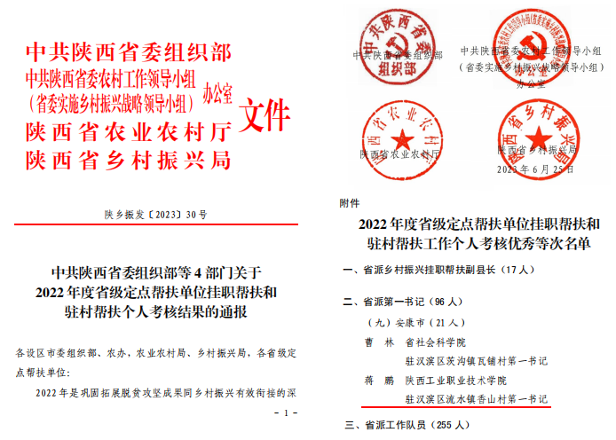日前,陕西省巩固拓展脱贫攻坚成果同乡村振兴有效衔接领导小组办公室下发《关于2022年度省级单位定点帮扶工作考核结果的通报》(陕巩衔办发〔2023〕3 号)文件,对2022年度省级单位定点帮扶工作考核结果进行了通报。我校被评定为定点帮扶工作成效考核评价最高等次“好”,这也是我校连续第五年获得该成绩。在省委组织部、省委农办、省农业农村厅、省乡村振兴局下发《中共陕西省委组织部等4部门关于2022年度省级定点帮扶单位挂职帮扶和驻村帮扶个人考核结果的通报》(陕乡振发〔2023〕30号)文件中,我校派驻安康市汉滨区流水镇香山村第一书记蒋鹏获评省级定点帮扶单位第一书记考核“优秀”等次。