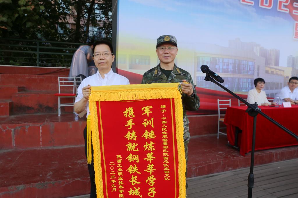 最后,党委书记惠朝阳向武警咸阳支队领导赠送锦旗。在渭城、经开两校区党委书记惠朝阳、党委副书记贺天柱宣布2023级学生军训正式闭营。
