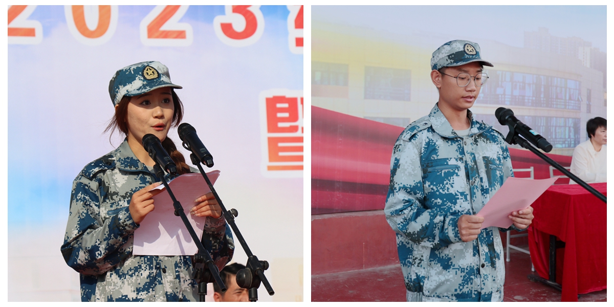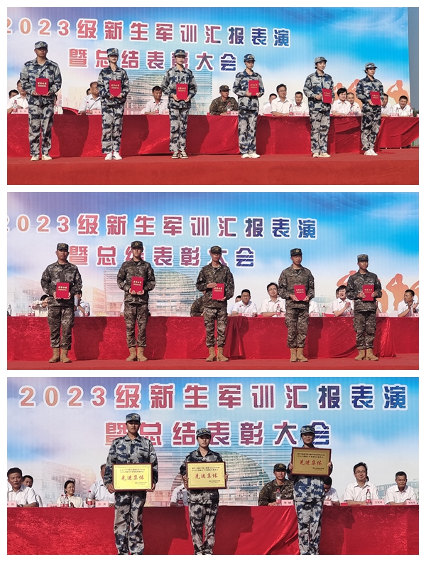 在宣读了对军训先进集体、先进个人和优秀教官的表彰决定后,学院领导为获奖集体和个人颁发了奖状及证书。航空学院机电2302班杨文杰、商贸学院物流2303班骆婉清分别代表全体新生分享了军训感想,总结了军训带给自己的成长与磨练,并对全体承训官兵表达了感谢。