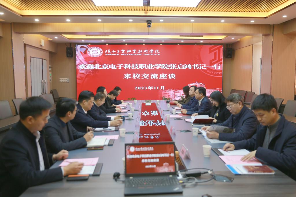 座谈会上,惠朝阳首先对张启鸿一行的来访表示热烈欢迎。双方共同观看了学校宣传片《红色匠心》,惠朝阳聚焦我校新校区建设、“双高”建设、申办职教本科三件大事,详细介绍了我校党建与思政、教学改革、产教融合、信息化建设等方面工作情况,分享了学校党建体系建设做法及经验。张启鸿对我校取得的成绩给予充分肯定,并简要介绍了北京电子科技职业学院基本情况及办学现状,并希望与我校进一步加强联系,互相学习,共谋发展。随后,双方相关部门围绕党建与思想政治、“双高”建设、校企合作、智慧校园建设等工作进行了对口交流。