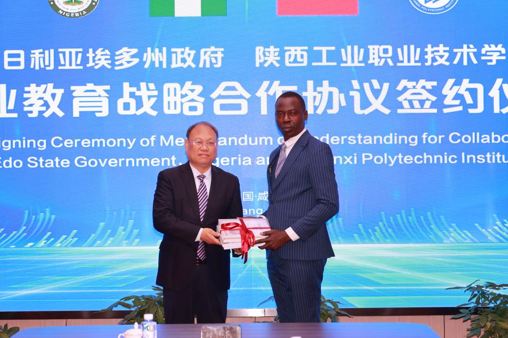 仪式上,田昊副书记代表学校与琼·奥维亚韦厅长签署了《尼日利亚埃多州政府与陕西工业职业技术学院职业教育战略合作协议》,刘清副校长代表学校与西尔维斯特·奥莫鲁伊校长、苗森部长签署了《尼日利亚秦工苑合作共建协议》,并与合作方共同为尼日利亚秦工苑揭牌。刘清副校长向西尔维斯特·奥莫鲁伊校长赠送了学校的国际化教学标准、教材。