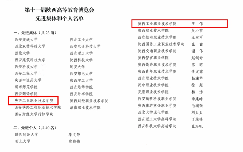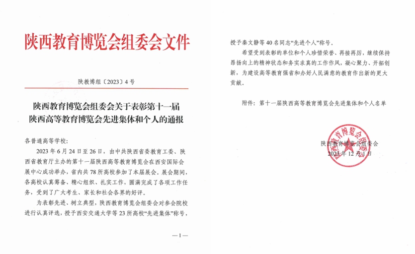 6月24日至26日,由中共陕西省委教育工委、陕西省教育厅主办的第十一届陕西高等教育博览会在西安国际会展中心成功举办。为表彰先进、树立典型,陕西教育博览会组委会经对参会院校进行认真评选,我校等23所高校被授予“先进集体”称号,王伟等全省高校40名同志被授予“先进个人”称号。