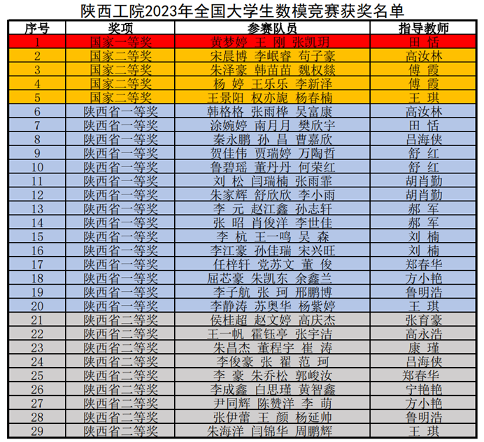 近日,2023年全国大学生数学建模竞赛获奖名单正式公布。我校国家级奖项数量再创新高,共获国奖5项,其中一等奖1项、二等奖4项,国省级奖项共计29项。参赛人数及获奖数量稳居全省高职院校前列。公共课教学部国家一等奖指导教师田恬获评陕西赛区优秀指导教师,学校获陕西赛区优秀组织工作奖。