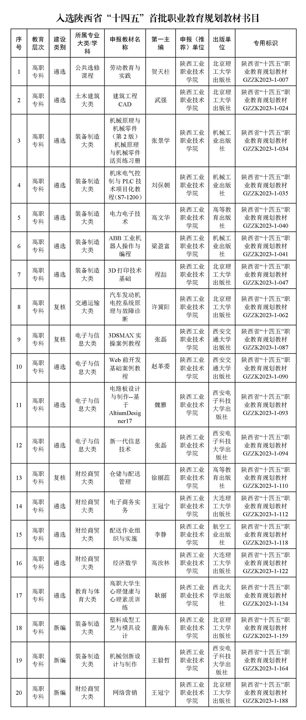 近日,陕西省教育厅公布了《陕西省“十四五”首批职业教育规划教材书目的通知》。我校共有20本教材入选陕西省“十四五”首批职业教育规划教材书目,居全省高职首位。