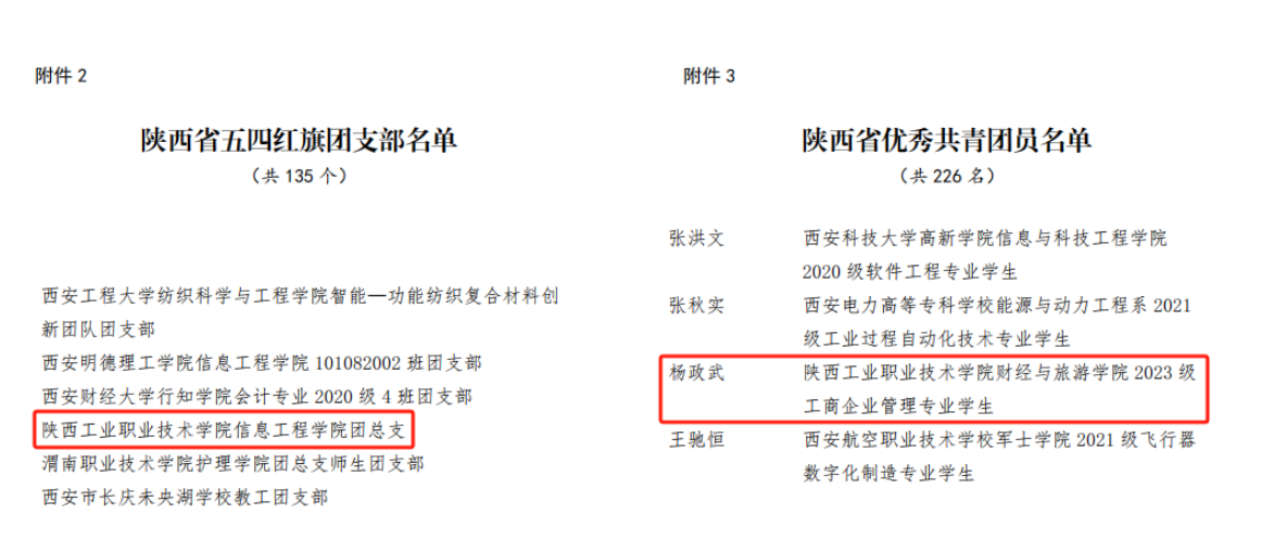 近日,共青团陕西省委印发了《共青团陕西省委关于表彰2022-2023年度陕西省五四红旗团委、陕西省五四红旗团支部、陕西省优秀共青团员、陕西省优秀共青团干部的决定》,我校信息工程学院团总支荣获“陕西省五四红旗团支部”称号,财经与旅游学院工商企业管理2301班杨政武同学荣获“陕西省优秀共青团员”称号。