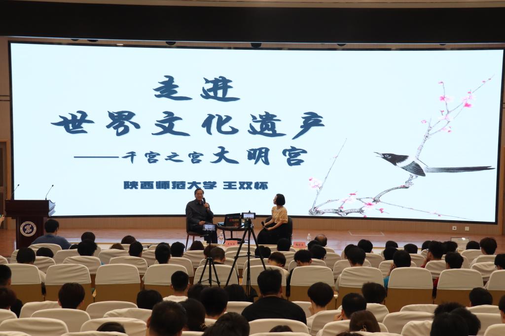 5月15日下午,我校第五期“工圕·真人图书馆”系列活动在学术会堂拉开帷幕。本期主题为“走进世界文化遗产——千宫之宫大明宫”,主讲人为陕西师范大学历史文化学院教授、博导、“百家讲坛”主讲嘉宾王双怀老师,主持人为图书馆张敏敏老师。我校副校长梅创社、图书馆馆长王丁、副馆长王艳及师生代表400余人在渭城校区现场参加了此次活动,经开校区分会场200余人同步观看直播,累计700余人通过公众号直播观看了此次活动。