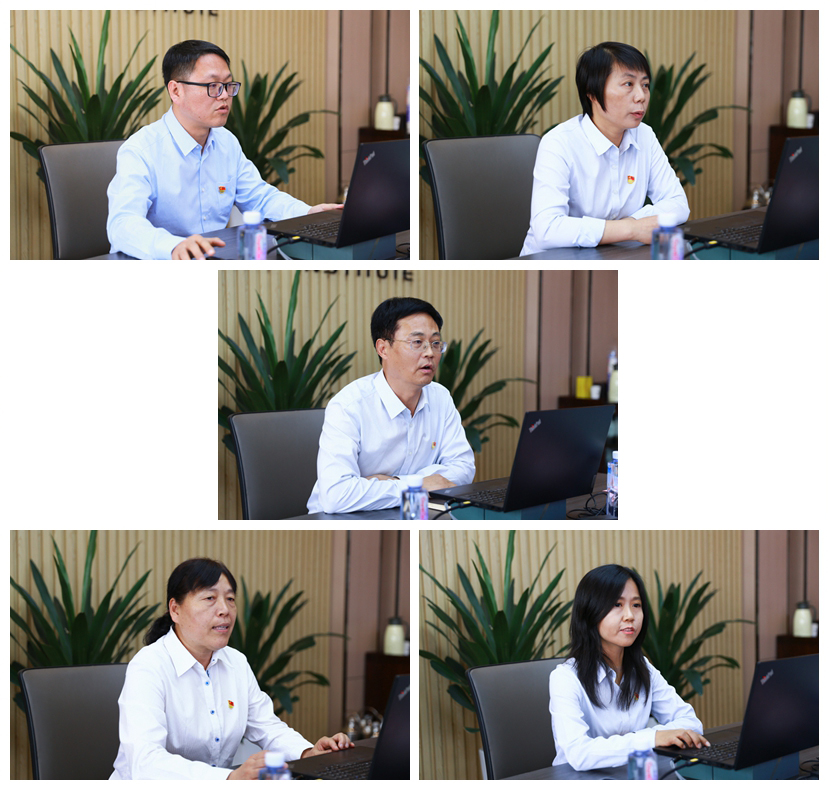 党委委员、党委组织部部长王超联同志代表学校党委以“求强思变 先行示范 智造高质量红色引擎”为题,分别从建设总体情况、创新举措、建设成果、示范发挥等四个方面汇报全国党建工作示范高校建设情况。随后,材料工程学院教师党支部、学生工作党支部、商贸与流通学院教师党支部、化工与纺织服装学院教师党支部负责人依次汇报了各建设单位的创建情况及成效。