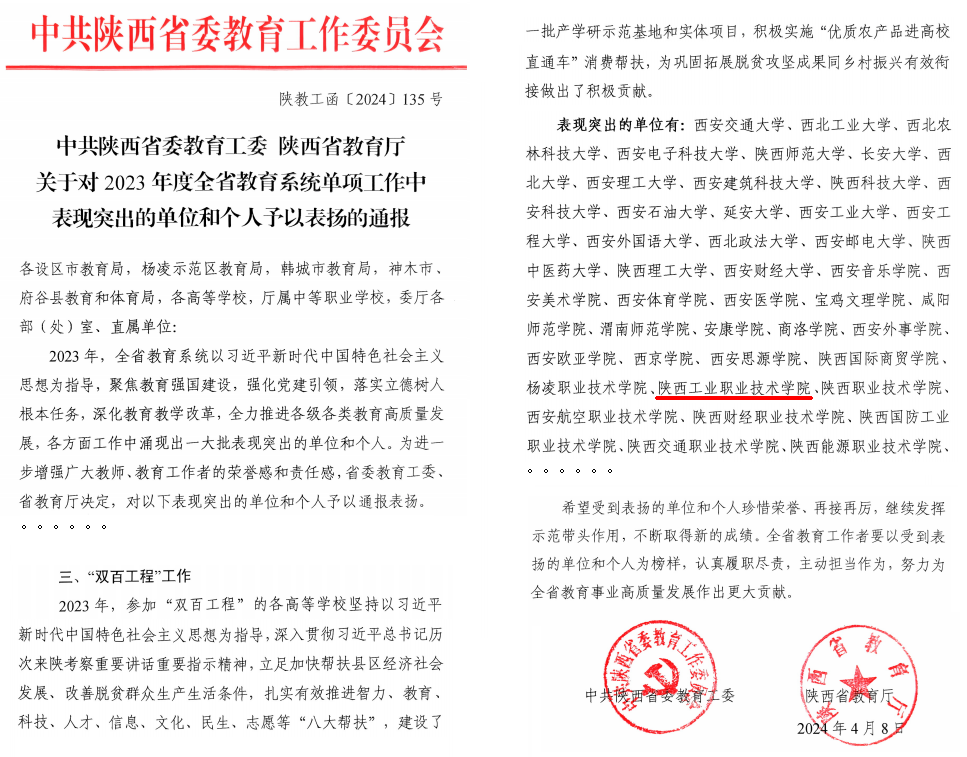 日前,中共陕西省委教育工委、陕西省教育厅发布《关于对2023年度全省教育系统单项工作中表现突出的单位和个人予以表扬的通报》(陕教工函[2024]135号),其中对2023年度“双百工程”表现突出单位进行了通报表彰,我校再次获得“‘双百工程’工作表现突出单位”荣誉称号,这是我校连续第五年受到表彰。