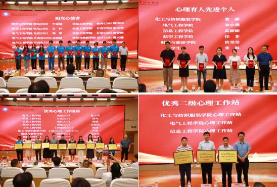 会议伊始,在场全体师生共同观看了第九届“阳光护航”心理育人宣传季实践活动剪影。接着,由学生处副处长耿丽进行心理育人宣传季实践活动总结,汇报了我校心理健康教育工作及“阳光护航”心理育人宣传季系列活动的开展情况。会上,由化工与纺织服装学院曹淼、电气工程学院李小燕、信息工程学院武丽丽三位老师作为优秀心理工作站站长,就“一站一品”系列心理活动开展情况分别进行了经验交流,随后,各二级学院依次进行了活动成果展示。随后,学工部部长、学生处处长郝军宣读表彰决定,对化工与纺织服装学院等3个“优秀二级心理工作站”、信息工程学院计应2303班等13个“优秀心理工作班级”、化工与纺织服装学院曹淼等6名“心理育人先进个人”、航空工程学院牛忠斌等12名“阳光心使者”,以及材料工程学院李泽阳等83名优秀心理委员、材料工程学院刘硕等35名优秀宿舍心理安全员、材料工程学院王启超等9名大学生心理健康协会优秀会员进行了表彰。