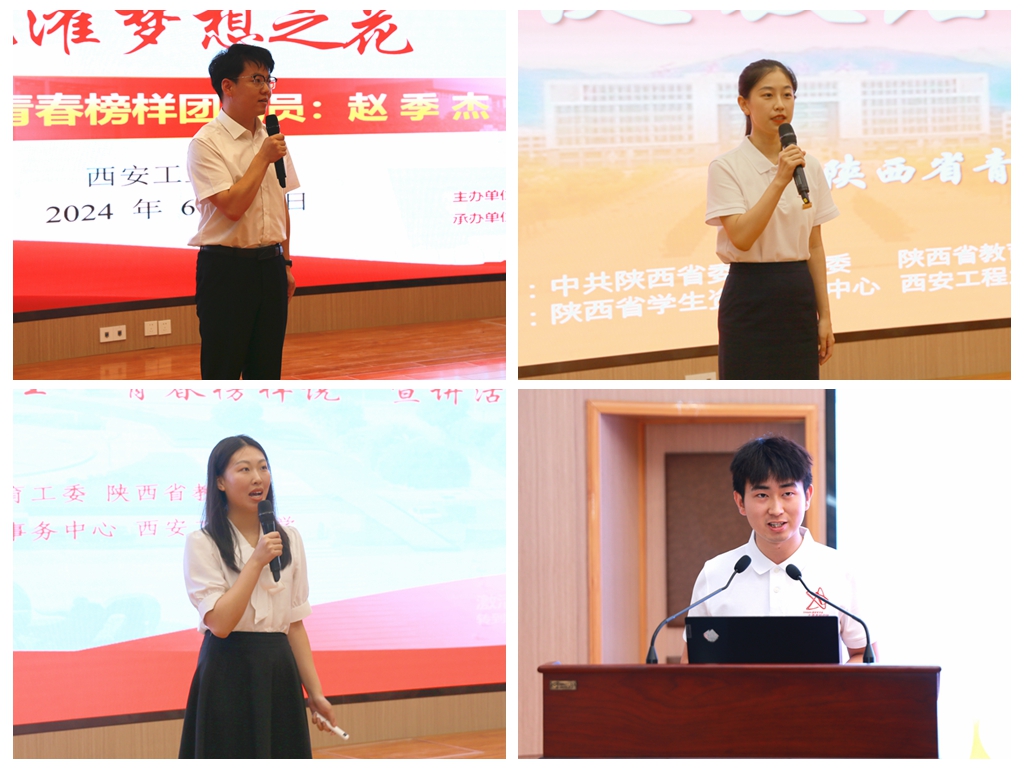 活动邀请到陕西省第二届“青春榜样团”成员西安工业大学赵季杰、西安石油大学接叶楠同学、西安工程大学张嘉轩,以及陕西省第二届国家奖学金获奖学生“青春榜样团”提名人选我校机械工程学院汪凡凡。西安工业大学赵季杰博士以《认真“答卷”,在科研的花园里浇灌梦想之花》为题进行宣讲,分享了自己在科研道路上的心路历程和奋斗之路。他结合自身经历与大家共勉,他说:“回首往事,我深切地感受到,人生没有标准答案,每一个选择都要坚持不懈。我们不但要答好高考的答卷,更要答好青春的‘答卷’、人生的‘答卷’”。西安石油大学硕士研究生接叶楠同学以《西部支教‘楠叶’茂 祖国绽放石油花》为主题,从支教微光汇扶志星火、科研小白欲上下求索、能源报国绽放石油花三个方面分享了自己的个人成长、追梦路上的所思所悟。西安工程大学本科生同学以《青春披锦绣,人生着华服》为主题,向我们讲述了她,刻苦钻研,勇于探索,积极投身志愿服务工作,以微笑面对挑战,用拼搏书写奋进,不忘初心,追光而行,用实际行动践行“崇真尚美,经纬天下”的大学精神。我校机械工程学院学生汪凡凡同学以《争做下一个火箭心脏“钻刻师”》为主题,向我们讲述了他利械报国,逐梦航天科技梦的成长经历,立志成为有理想、敢担当、能吃苦、肯奋斗的新时代好青年,用实际行动诠释新时代新青年的责任与担当,朝着火箭心脏“钻刻师”的大国工匠梦想砥砺前行,为航天事业贡献自己的青春力量。