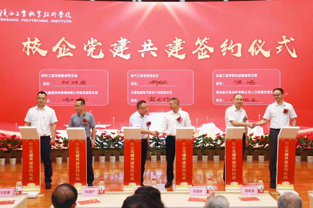 会上,副校长段峻为政校企党建共建先进工作者颁奖,机械工程学院先进制造党支部与西安航天发动机有限公司人力资源处党支部、材料工程学院教师党支部与彩虹集团特种玻璃有限公司研发部党支部、电气工程学院党总支与正泰智能电气西北产业园党总支进行党建共建现场签约,种下智慧树、开出友谊花,在强强联合中拓宽学校与地方、企业合作的广度和深度,有效推进上下互通、内外交融的党建工作格局,努力实现党建工作质量全面创优、全面示范。