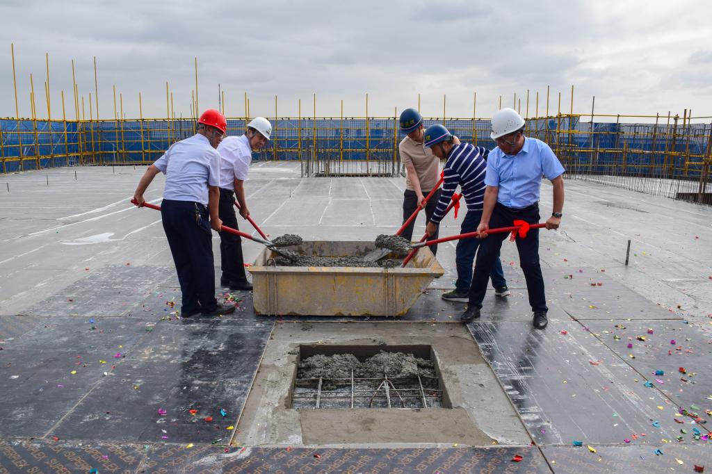 最后,现场嘉宾、领导、职工一起挥锹填砼、合力封顶,标志着该项目建设全面转入砌体砌筑、二次结构、机电安装、内部装饰、室外工程建设阶段,可望明年6月竣工交付。