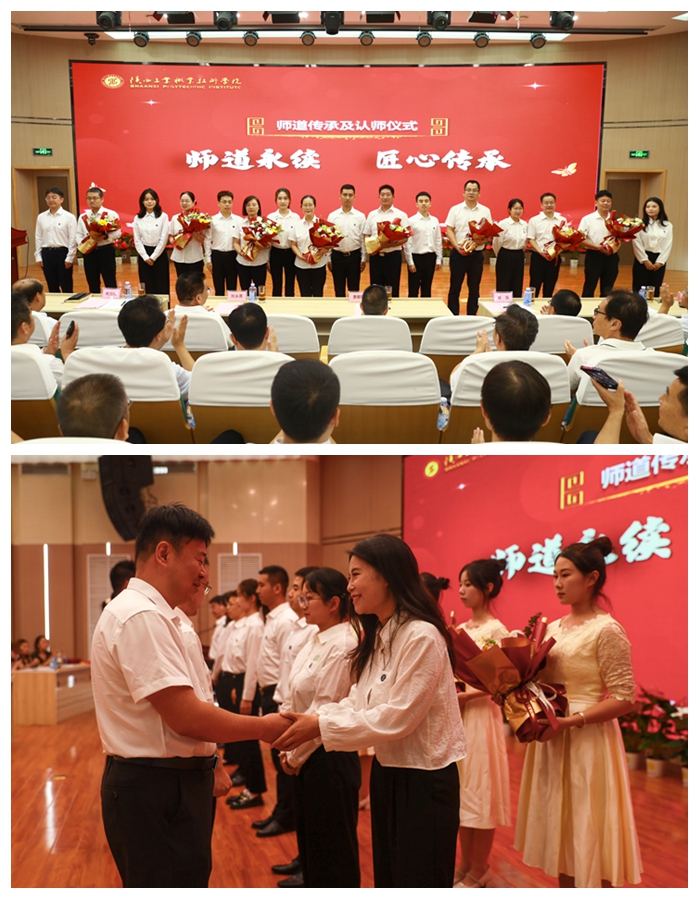 在第二个“青蓝相继躬耕教坛 弦歌不辍薪火相传”篇章。师者如光、誓言铮铮,首先举行新教师入职宣誓仪式,领誓人李云教授带领全体新入职老师进行庄严宣誓,会场上嘹亮的声音,铿锵的誓言,表达了新教师牢记使命、踔厉奋发的坚定信念和决心。青蓝薪火传,师道共传承,接着举行师道传承暨认师仪式,旨在发挥名师的“传、帮、带”作用,弘扬师德传承匠心,提高新教师教育教学水平,现场庄重的仪式、热烈的掌声、传递着浓浓师徒情,增强了新教师教书育人的责任感、使命感和荣誉感。