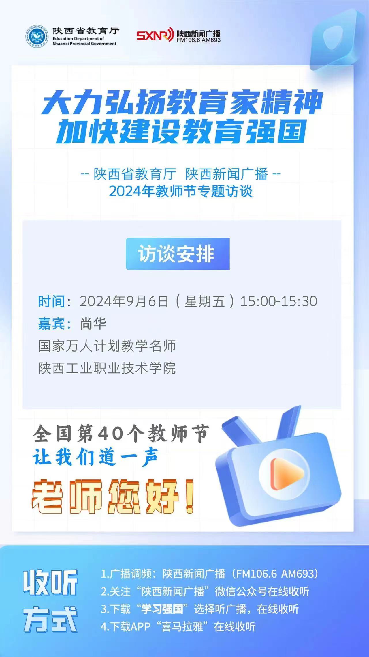 9月6日,在第40个教师节来临之际,我校化工与纺织服装学院尚华教授应邀做客陕西广播电台《1066教育直通车》教师节“大力弘扬教育家精神 加快建设教育强国”专题访谈栏目,进行教学与科研经验分享交流,并为听众们答疑解惑。