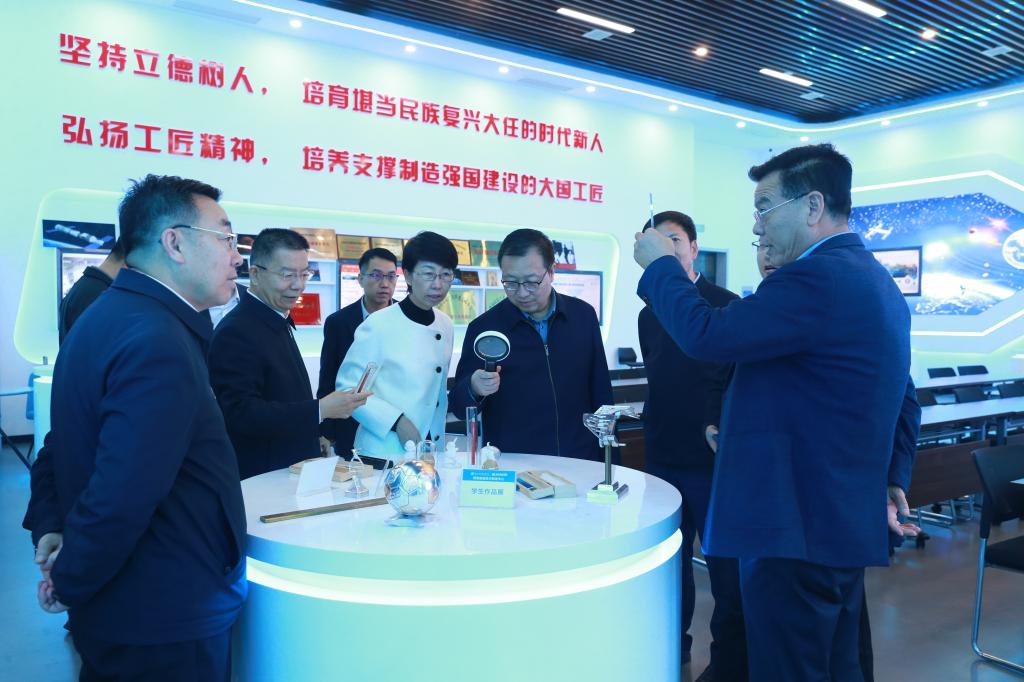 王成峰一行参观了学校智能制造协同创新中心、先进制造技术工程中心、材料智能成型实训基地,了解学校办学特色、专业建设、学生技能培养等方面情况,听取了职产教融合相关工作,对我校的办学历史和成绩给予了高度评价,并就职业教育产教融合、职普融通等相关内容与学校领导进行了交流。