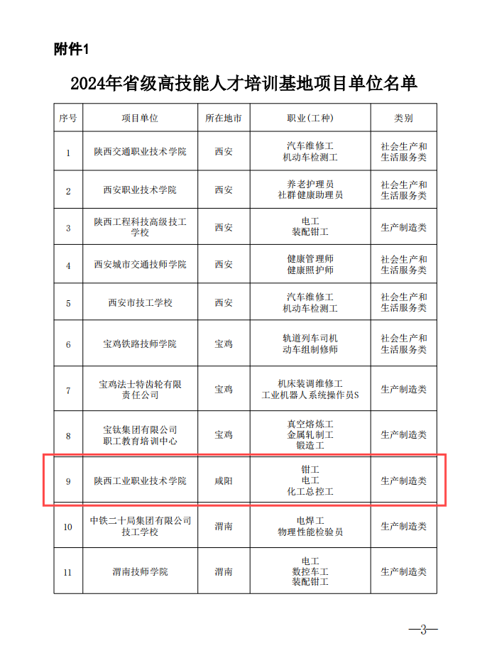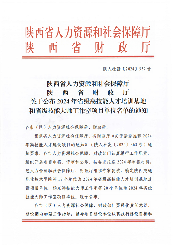 近日,陕西省人力资源和社会保障厅、陕西省财政厅印发《关于公布2024年省级高技能人才培训基地和省级技能大师工作室项目单位名单的通知》(陕人社函〔2024〕552号),我校成功获批2024年省级高技能人才培训基地建设项目单位。此次获批省级高技能人才培训基地,是我校第二次获得该项目立项,将有力支撑学校机械、电气、化工等专业办学能力提升。