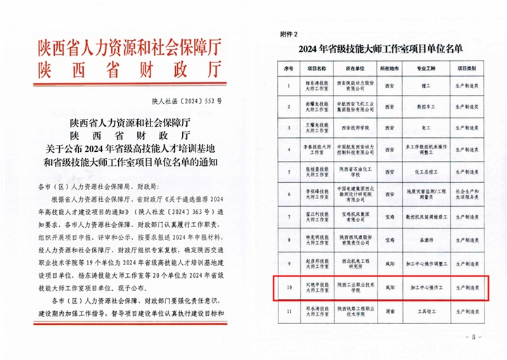 近日,省人力资源社会保障厅、省财政厅印发《关于遴选推荐2024年高技能人才建设项目的通知》(陕人社发〔2024〕363号),公布了2024年省级高技能人才培训基地建设项目单位和省级技能大师工作室项目单位。我校刘艳申老师主持申报的技能大师工作室被确定为省级技能大师工作室。