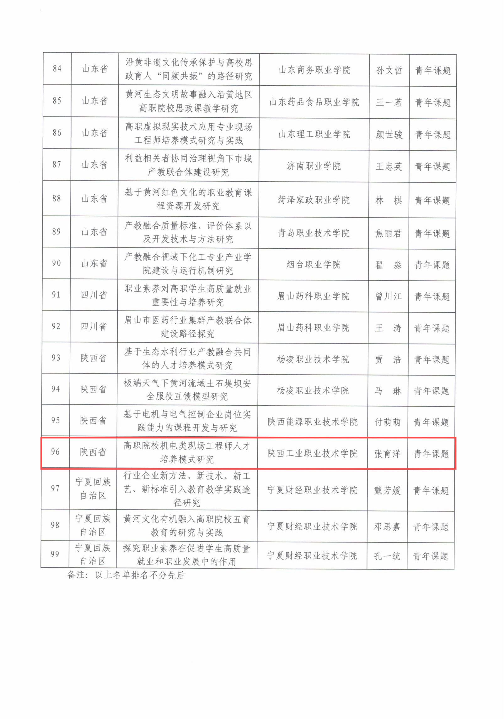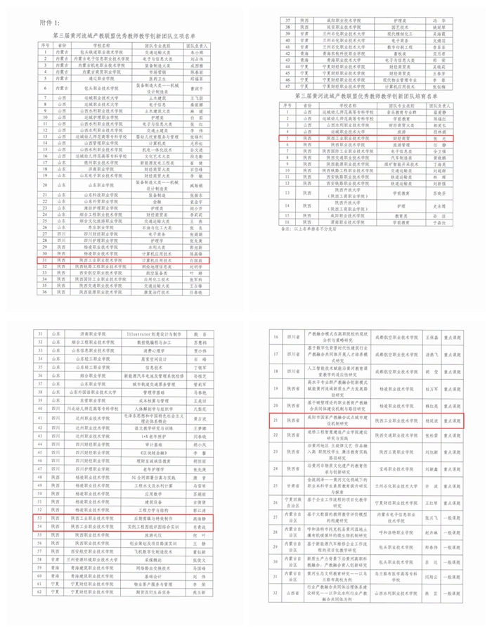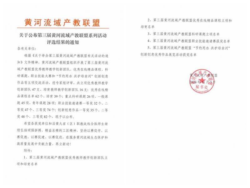 本次活动为黄河流域产教联盟开展的第三届活动,共有优秀教师教学创新团队、优秀在线精品课程、科研课题、职业技能大赛和“节约用水 共护母亲河”创新创意作品等五项活动,共立项优秀教师教学创新团队47支、培育教师教学创新团队16支;优秀在线精品课程名单62个,培育39个;重点科研课题26项、一般课题45项、青年课题28项。我校参与了优秀教师教学创新团队、优秀在线精品课程、科研课题三项目评选。下一步,学校将以此入选立项为契机,不断推动教育教学改革,进一步强化产教融合、科教融汇的力度,积极探索职业教育人才培养的创新路径,为服务黄河流域经济带发展和国家战略作出积极贡献。