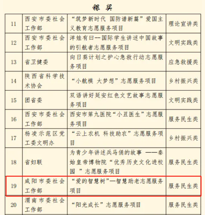 1月3日,陕西省首届“志愿三秦”项目大赛获奖名单公布,我校“爱的智慧树—智慧助老志愿服务项目”继荣获第七届中国青年志愿服务项目大赛铜奖、陕西省第一届青年志愿服务项目大赛银奖后,又成功斩获陕西省首届“志愿三秦”项目大赛银奖。
