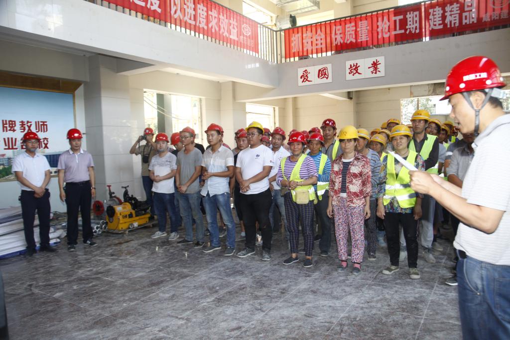陕西百威建设工程监理有限公司项目总监王飞超、陕西省咸阳市建筑安装总公司副总经理胡彦昌先后致辞,介绍了笃学楼A改建项目的基本情况并对学院各级领导对该项目的重视和关怀表示感谢。学院副院长梅创社代表学院党政和全院两万余名师生向工程项目的施工企业、监理单位、设计单位员工们的辛勤付出表示衷心的感谢。时值酷暑,他叮嘱建筑工人们在高度重视施工安全和质量、进度的同时,要合理调整施工时段,做好防暑降温工作。