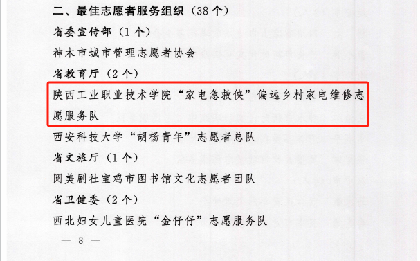 近日,省委社会工作部、省委宣传部、省民政厅、省人力资源和社会保障厅、省卫健委等部门在全省组织开展的陕西省志愿服务“四个最美(佳)”先进典型学习推选活动结果公布,我校“家电急救侠”偏远乡村家电维修志愿服务队荣获陕西省“最佳志愿者服务组织”,全省共38个志愿者服务组织入选,其中入选的高校志愿者服务组织仅4个。